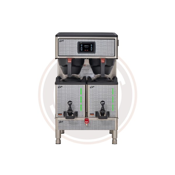 Upgrade your coffee brewing and service system with this Curtis G4GEMXTIFT10A1000 G4 Gemini IntelliFresh Twin 1.5 gallon satellite coffee brewer with 2 FreshTrac servers. This unit features G4 controls with a 4 3/8" touch screen with programmable digital controls so you can make sure you're delivering quality, flavorful coffee to your customers every time! With this icon-driven control system you can set up one-touch recipes and receive real time feedback on the brewing process. As part of the Gold Cup series, this brewer provides precise control over all the different aspects of brewing from time to volume to water bypass. Pre-set, one touch global recipes help simplify the use of this coffee brewer to improve efficiency in your banquet facility or conference center.
