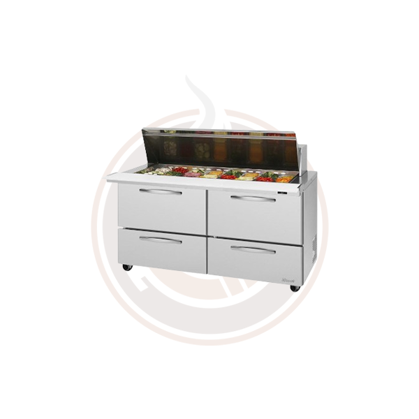 PRO Series Mega Top Sandwich/Salad Prep Table, two-section, 60-1/4″W x 34″D x 39-1/8″H, self-contained refrigeration with self-cleaning condenser, 19.0 cu. ft., capacity, 24-pan top opening with hood, (4) drawers, 9-1/2″ deep cutting board with side rail, digital temperature control & monitor system, cold bunker system, stainless steel interior & exterior (galvanized bottom), LED interior lighting & fan control, R290 Hydrocarbon refrigerant, 1/5 HP, 115v/60/1-ph, 8.9 amps, cord with NEMA 5-15P cETLus, ETL-Sanitation, Made in USA (contact factory for lead time)